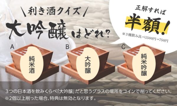 異なる区分の日本酒が入ったグラスを3種(A/B/C)用意して飲み比べ。該当する区分(一例:大吟醸)を当てれば、飲み比べ3種が半額になるスクラッチカード。