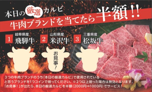お店が厳選した「おすすめ牛肉カルビ」を提供。3つの選択肢の中から牛肉のブランドを当てるスクラッチカード。見事当てれば牛肉カルビが半額になる特典。